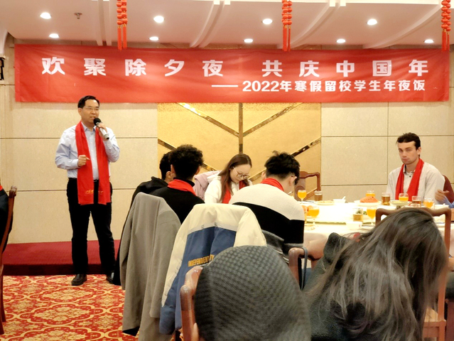 本网讯 1月31日晚,留校外地学生、国际学生齐聚一堂,共庆中国年,学校举行2022年山东理工大学留校学生年夜饭活动。党委书记吕传毅,党委常委、副校长易维明,党委(校长)办公室、学生工作部、研究生工作部、国际教育学院相关负责人与留校学生,共享年夜饭,共贺虎年新春。
