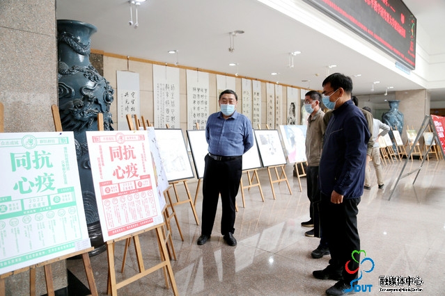 本网讯 为鼓舞士气、抗击疫情,致敬疫情防控一线工作人员,4月26日下午,由美术学院党总支主办的以“艺”战疫主题书画设计作品展在鸿远楼一楼大厅举行。校党委书记吕传毅,校党委副书记、校长胡兴禹,校党委副书记邓昌亮到场观展,党委(校长)办公室、美术学院负责人等陪同参观。