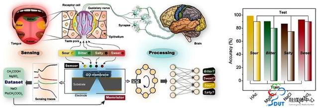 To address these challenges, based on stacked graphene-oxide films, researchers have developed a new nanoionics device integrating sensing and computation, which could operate directly in aqueous phase. Ion-dynamics characterization and finite-element simulations reveal that interfacial adsorption-desorption within the graphene-oxide sheets dramatically retards ion mobility, endowing the device with both ion-sensing and memristive characteristics. Exploiting the sensing capability, the team has built a library of chemical signatures for a broad range of flavors, while the device’s neuromorphic properties are used to implement a reservoir-computing network that mimics an artificial gustatory system. Working in physiological conditions, the single chip delivers simultaneous sensing and computation, laying the groundwork for integrated sensing-storage-computing system for smart gustatory applications in liquid settings and offering new hope for patients who have lost their sense of taste.